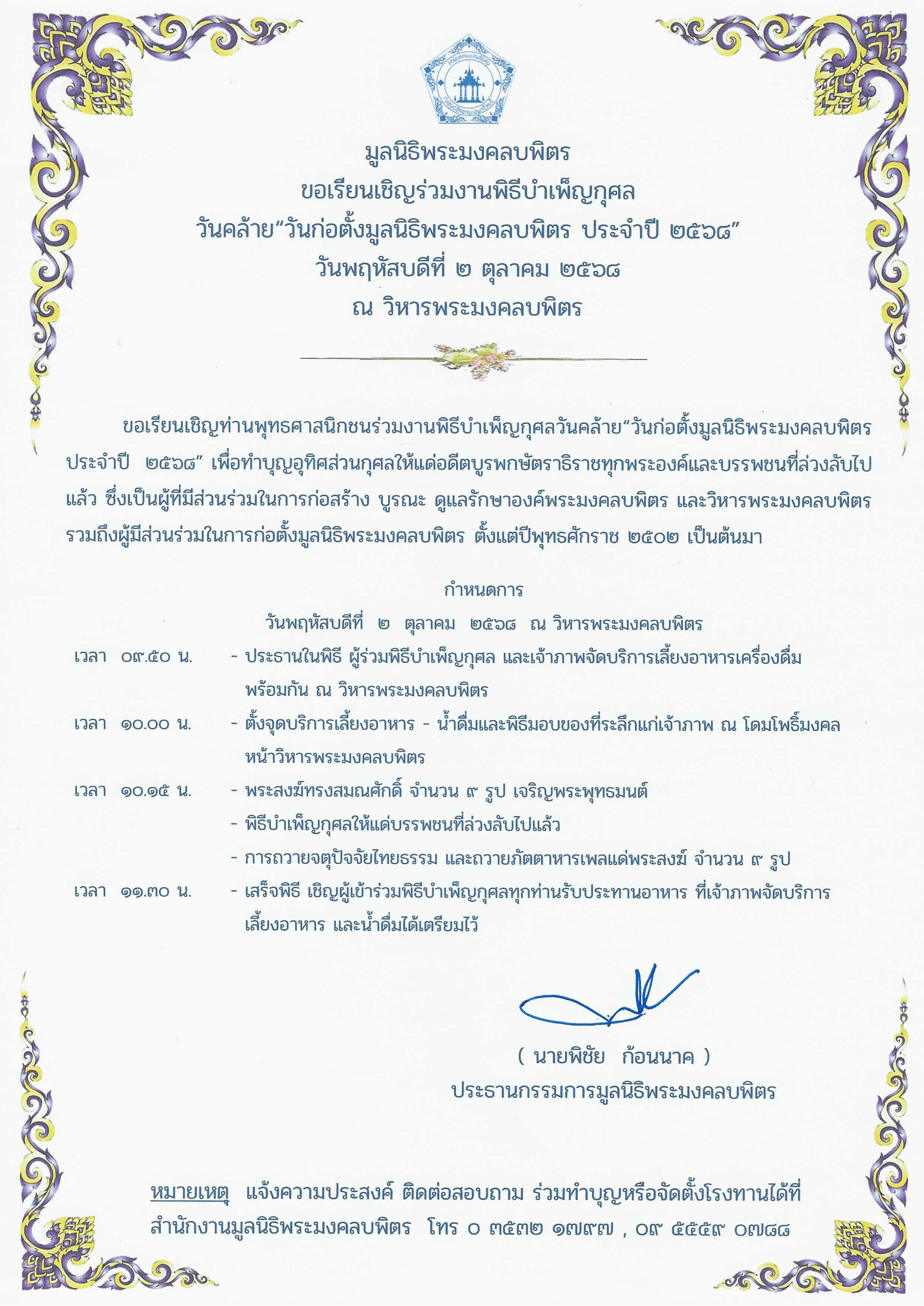 หมายเลขบัญชีการบริจาคเพื่อสมทบทุนบูรณปฏิสังขรณ์ วิหารพระมงคลบพิตร |